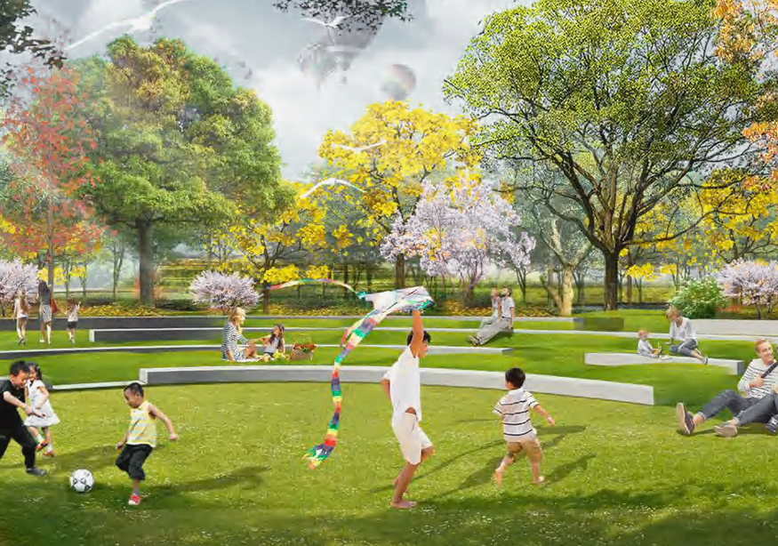 的綠化風格色彩延續(xù)。突出特色時增加開花品種(多年生)與綠色相呼應,強化場地色彩,突出季相特色,打造“疏林草地,四季繁花”的效果。