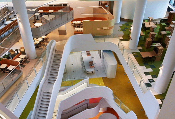 我們看到的滿眼的錯(cuò)綜復(fù)雜的樓梯從一般的觀點(diǎn)看來(lái)的確非常震撼,很酷。通常我們會(huì)很關(guān)注我們要到達(dá)的地點(diǎn),而往往忽略到達(dá)過程所處的空間。而這個(gè)特殊處理的樓梯則成為這里空間的焦點(diǎn),幾乎從任何地點(diǎn)都可以“感受”到它的存在,達(dá)到不被忽略的目的。